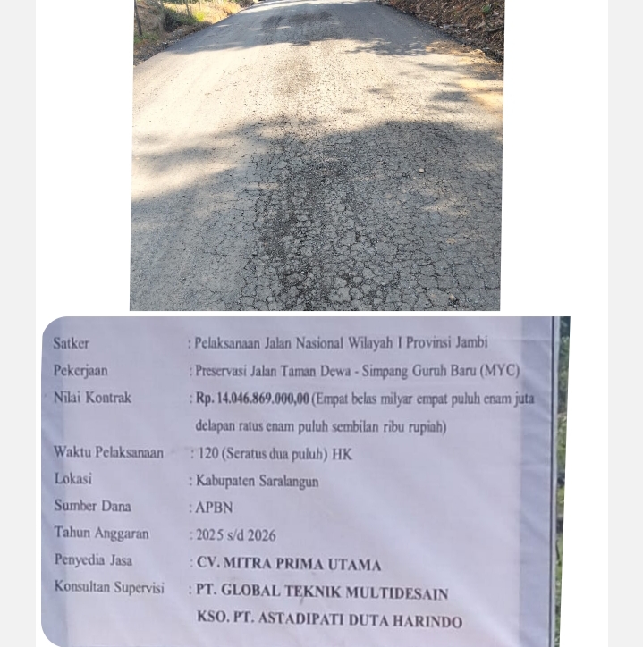 Sarolangun, Radarhukum.id – Warga di wilayah Kecamatan Mandi Angin kembali menyoroti rendahnya mutu pekerjaan pengaspalan jalan yang dikerjakan oleh CV Mitra Prima Utama. Proyek pada ruas Jalan Taman Dewa–Simpang Guruh Baru, yang menjadi akses penghubung ke Kecamatan Mandi Angin Timur, Kabupaten Sarolangun, Provinsi Jambi, diduga mengalami kerusakan meski baru selesai dikerjakan.