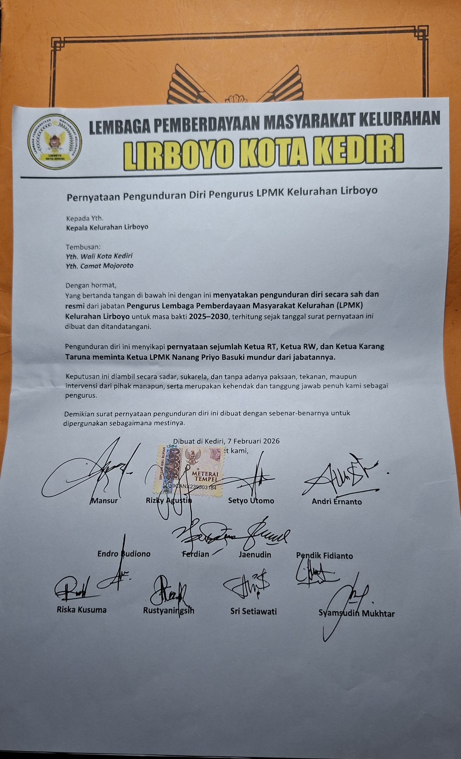 Kendati Ketua LPMK telah menyatakan pengunduran diri melalui Surat Pernyataan tertanggal 7 Februari 2026, para Ketua RT dan RW berharap pihak kelurahan segera menindaklanjuti dengan menggelar pemilihan Ketua LPMK yang baru, agar seluruh organisasi LKK di Kelurahan Lirboyo dapat kembali menjalankan tugas dan fungsinya secara normal.